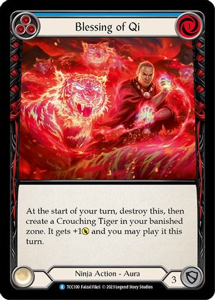 At the start of your turn, destroy Blessing of Qi then create a Crouching Tiger in your banished zone. It gains +1 Power and you may play it this turn.