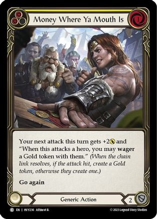 Your next attack this turn gets +2POWER and "When this attacks a hero, you may wager a Gold token with them." (When the chain link resolves, if the attack hit, you create a Gold token, otherwise they create one.)
