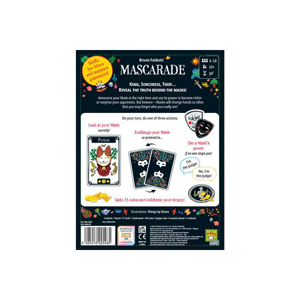 When it's your turn, you have three exciting actions to choose from: sneak a peek at your mask in secret, swap or pretend to swap masks with another player, or unleash the extraordinary power of your mask. The ultimate goal? Be the first player to collect 13 coins and emerge victorious!