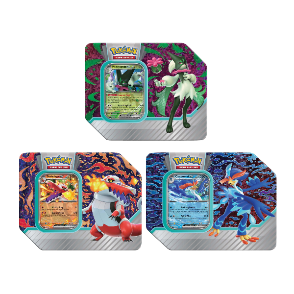 Take command of the battlefield with an evolved first partner Pokemon EX! Opt for Meowscarada EX's cunning magic, Skeledirge EX's fiery tunes, or Quaquaval EX's stunning dance in the Pokemon TCG: Paldea Partners Tin. Discover additional team members within the booster packs included!