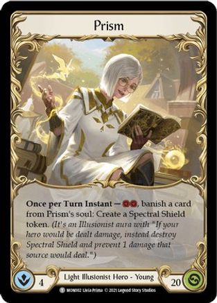 Once per Turn Instant - [2 Resource], banish a card from Prism's soul: Create a Spectral Shield token. (It's an Illusionist aura with "If your hero would be dealt damage, instead destroy Spectral Shield and prevent 1 damage that source would deal.")